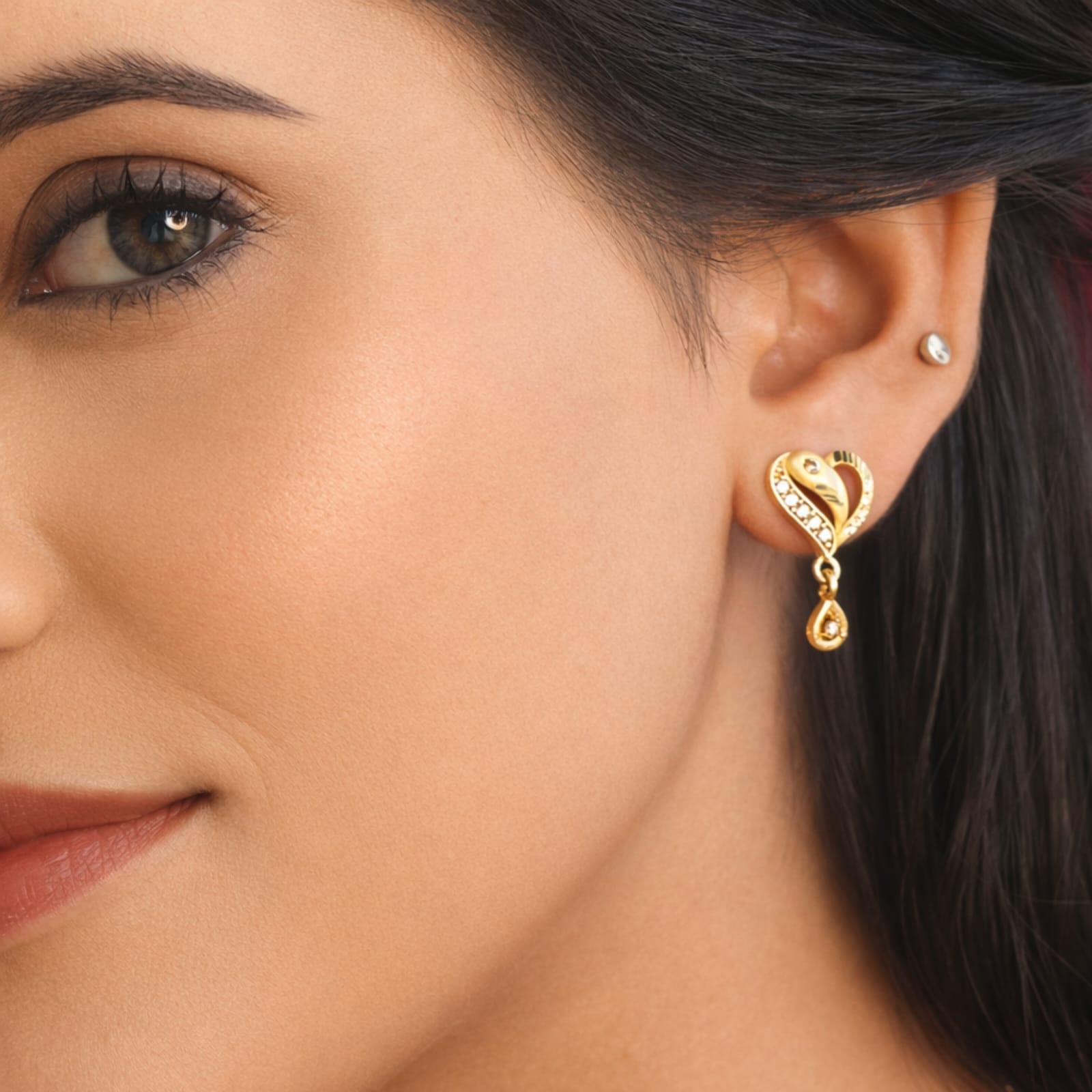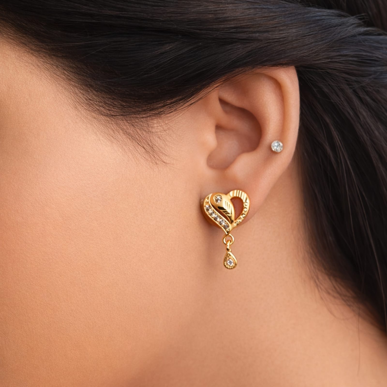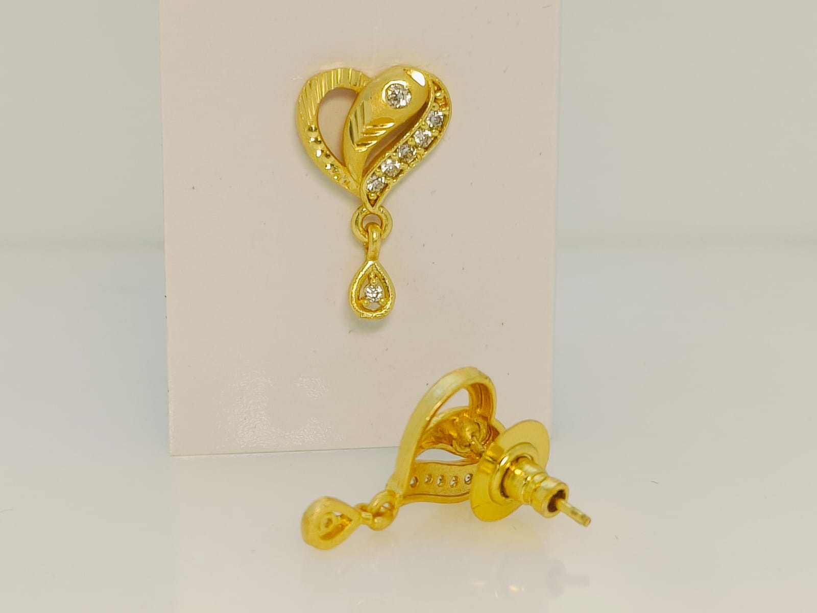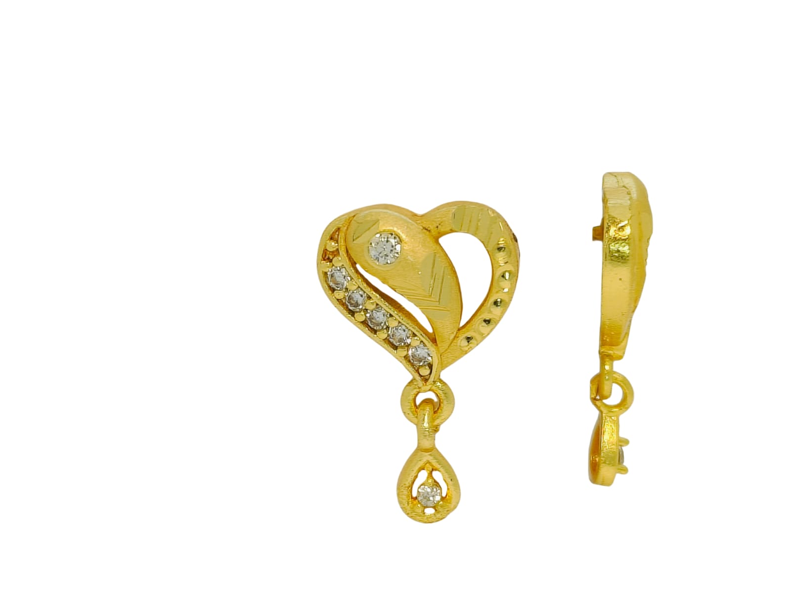 - Design: Each earring showcases a stylized, slightly elongated heart or paisley-like shape, crafted from polished yellow gold.