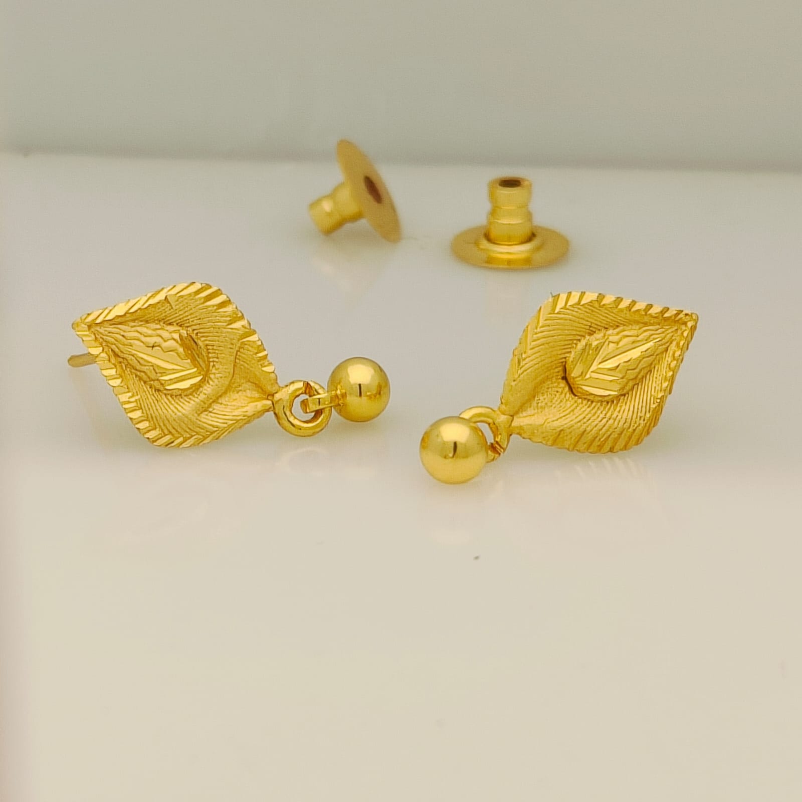 Elevate your jewelry collection with these exquisitely crafted Gold Leaf-Pattern Drop Earrings. Combining the classic appeal of yellow gold with intricate textural artistry, these earrings feature a sophisticated diamond-shape (rhombus) stud adorned with a stylized leaf motif. A high-polish dangling gold bead adds a touch of movement and grace, making them perfect for both daily wear and special occasions.