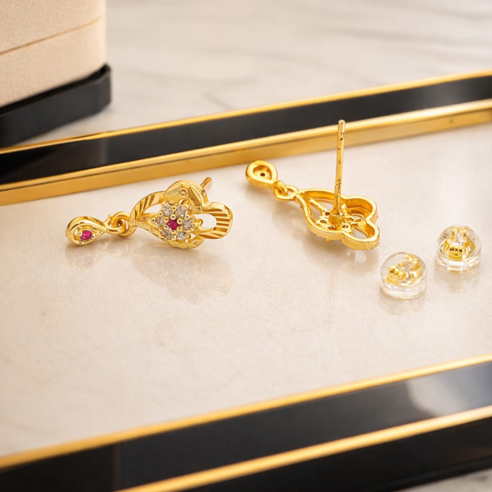 Embrace timeless elegance with these captivating drop earrings, featuring a vibrant splash of color. This pair combines the romantic allure of a heart-shaped silhouette with the classic beauty of a ruby-toned floral center, making it a standout addition to any jewelry box.