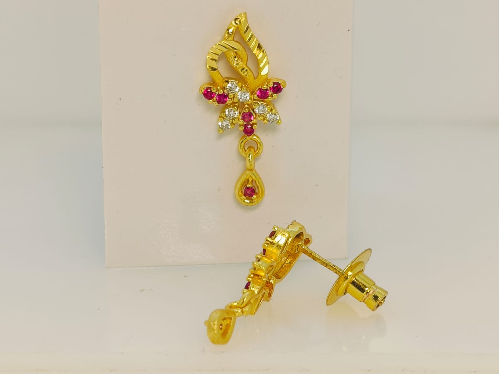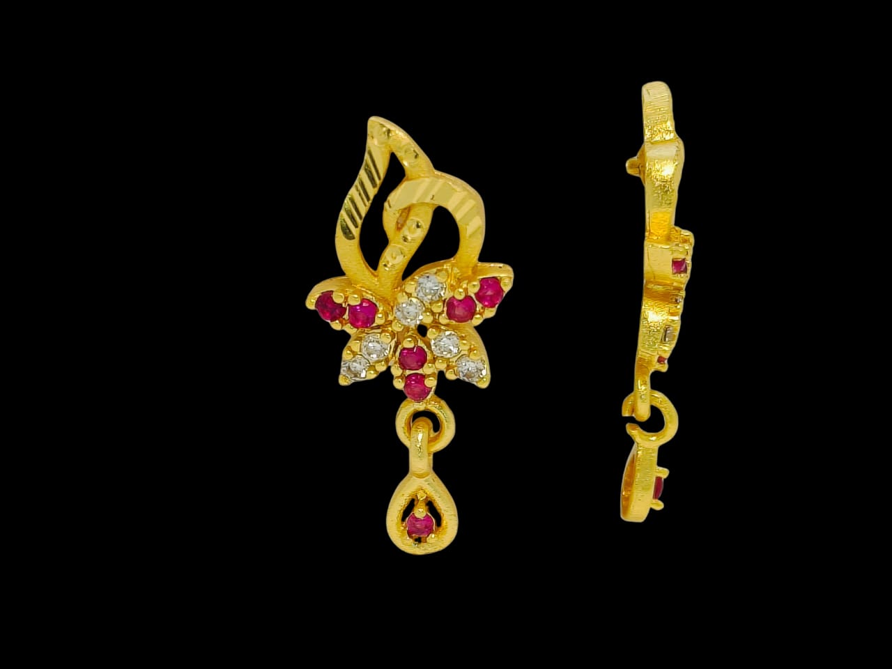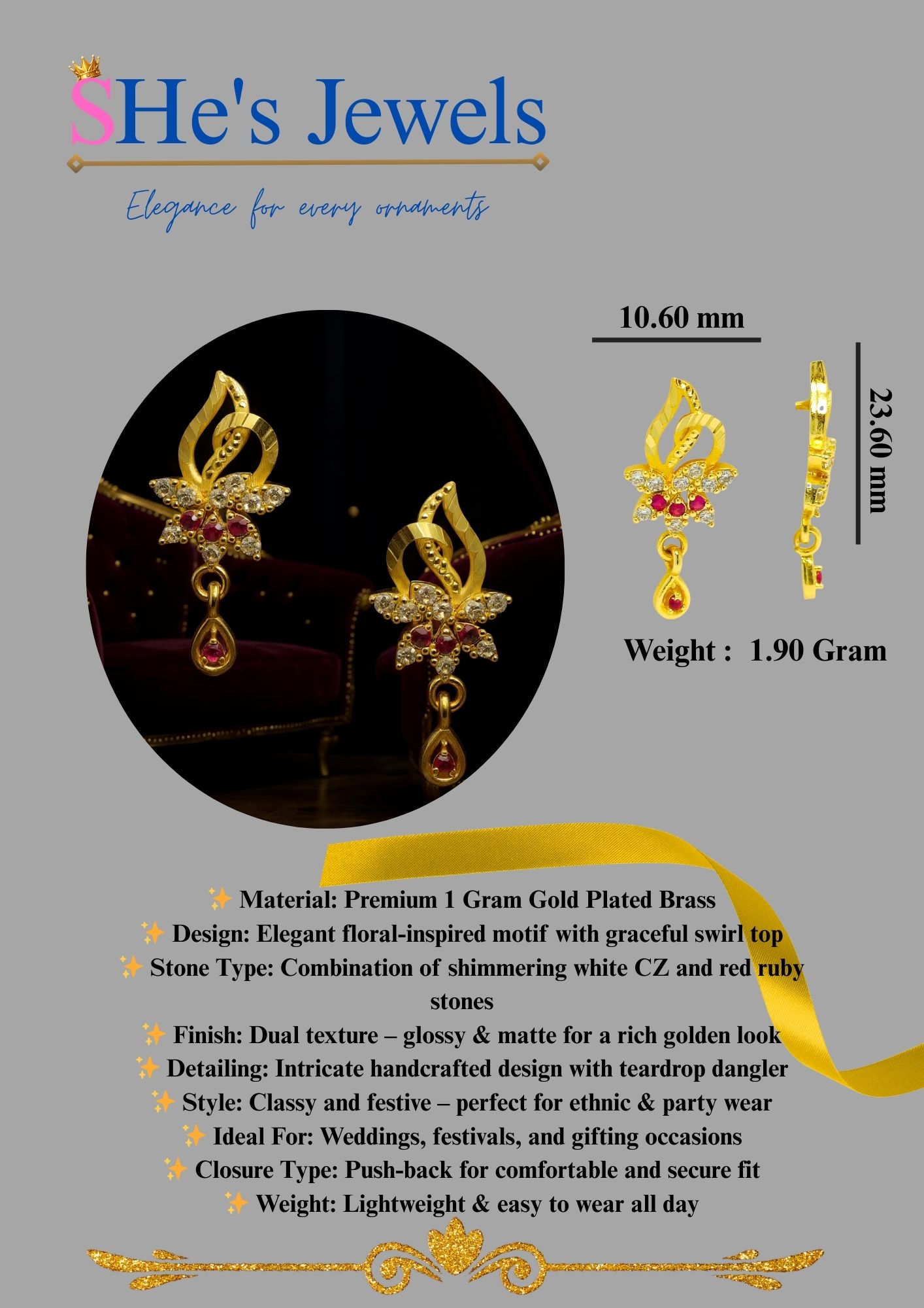 Stones: Features a gorgeous color contrast, with alternating rubies (or deep pink stones) and white/clear stones in the floral motif. The teardrop dangle holds a single ruby.