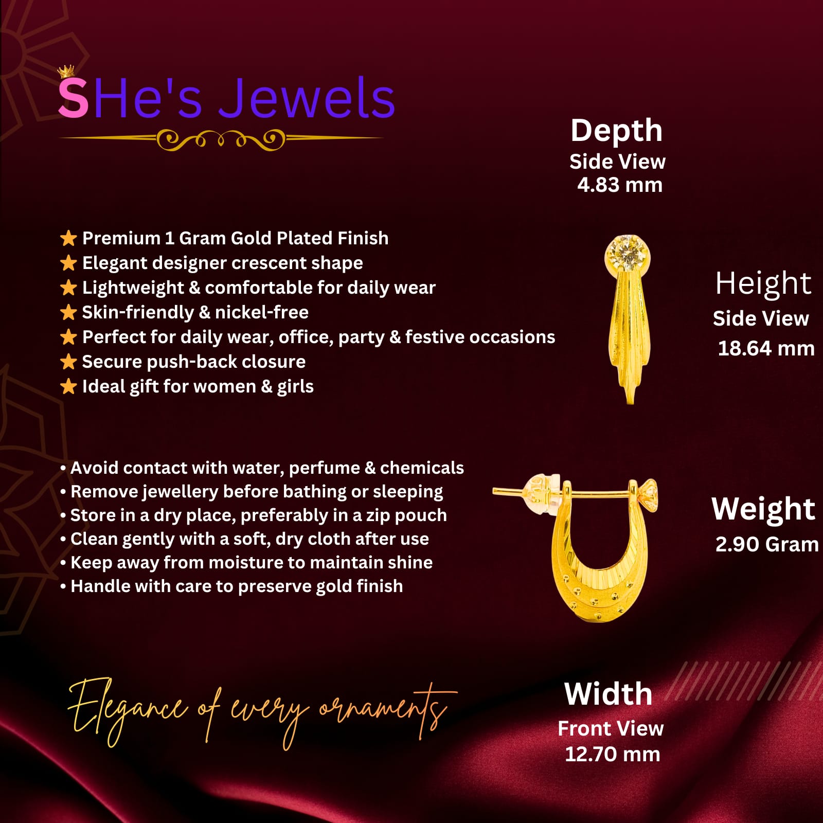 - Comfortable Stud Design: Equipped with smooth gold-toned posts and secure, clear silicone-backed closures for all-day wearable comfort.