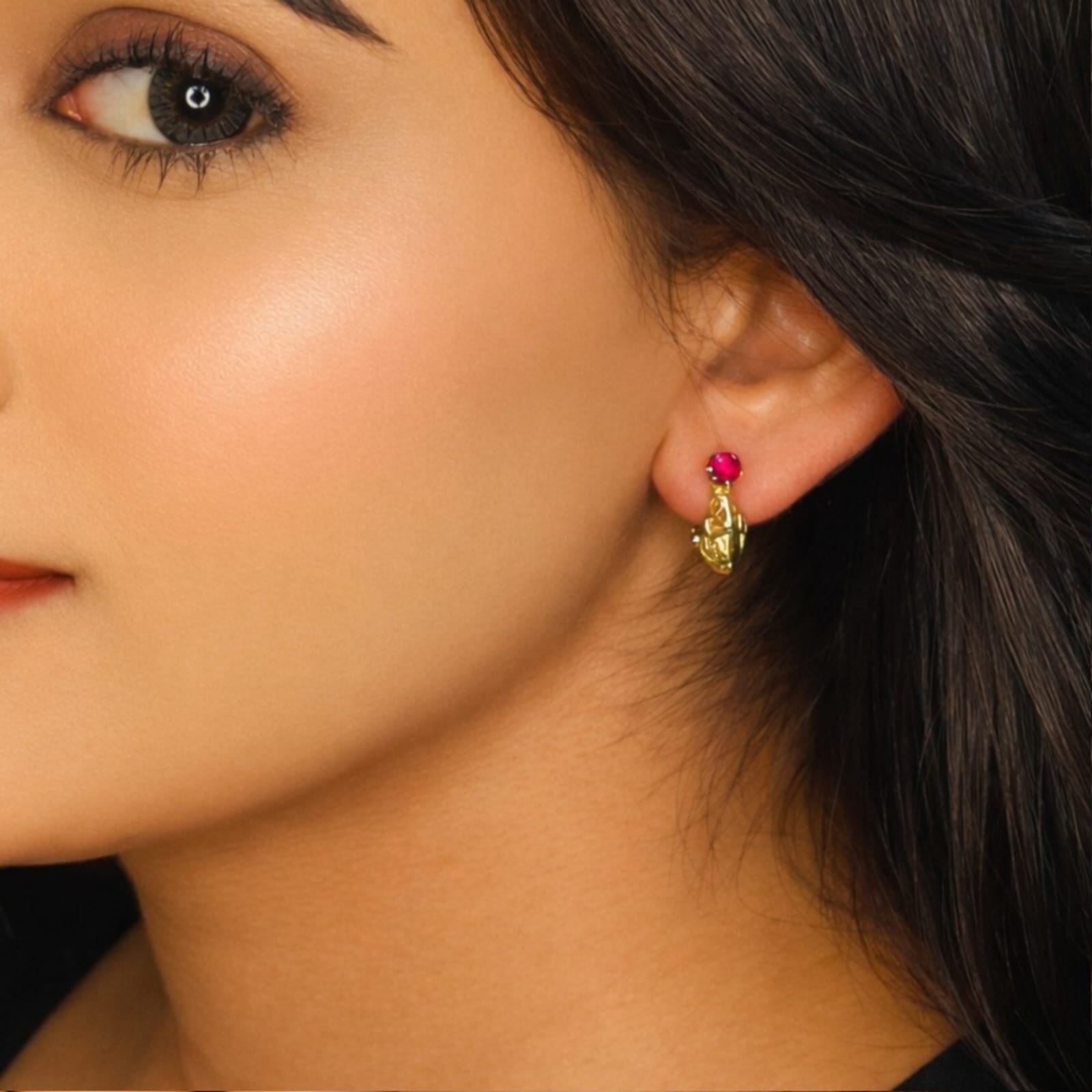 - Vibrant Gemstone: Adorned with a single, brilliant ruby-red stone held securely in a multi-prong setting at the ear post.