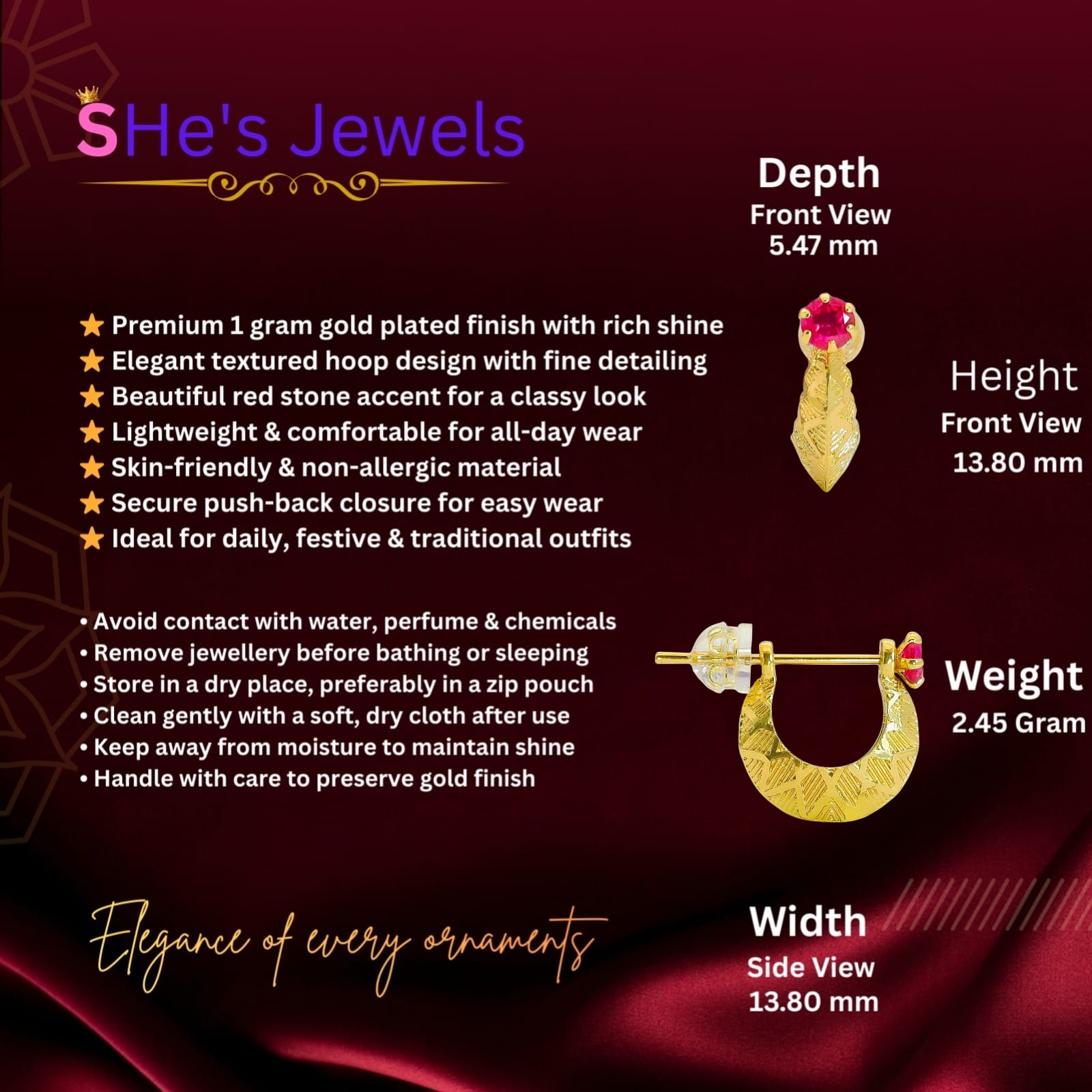 These modern crescent-style earrings feature a bold architectural design paired with intricate surface detailing. The wide, gold-plated body is embossed with a sharp zig-zag and cross-hatched geometric pattern that creates a dynamic play of light and shadow. A vibrant, prong-set ruby-red stone sits at the crown of each piece, offering a sophisticated contrast to the warm gold metalwork.