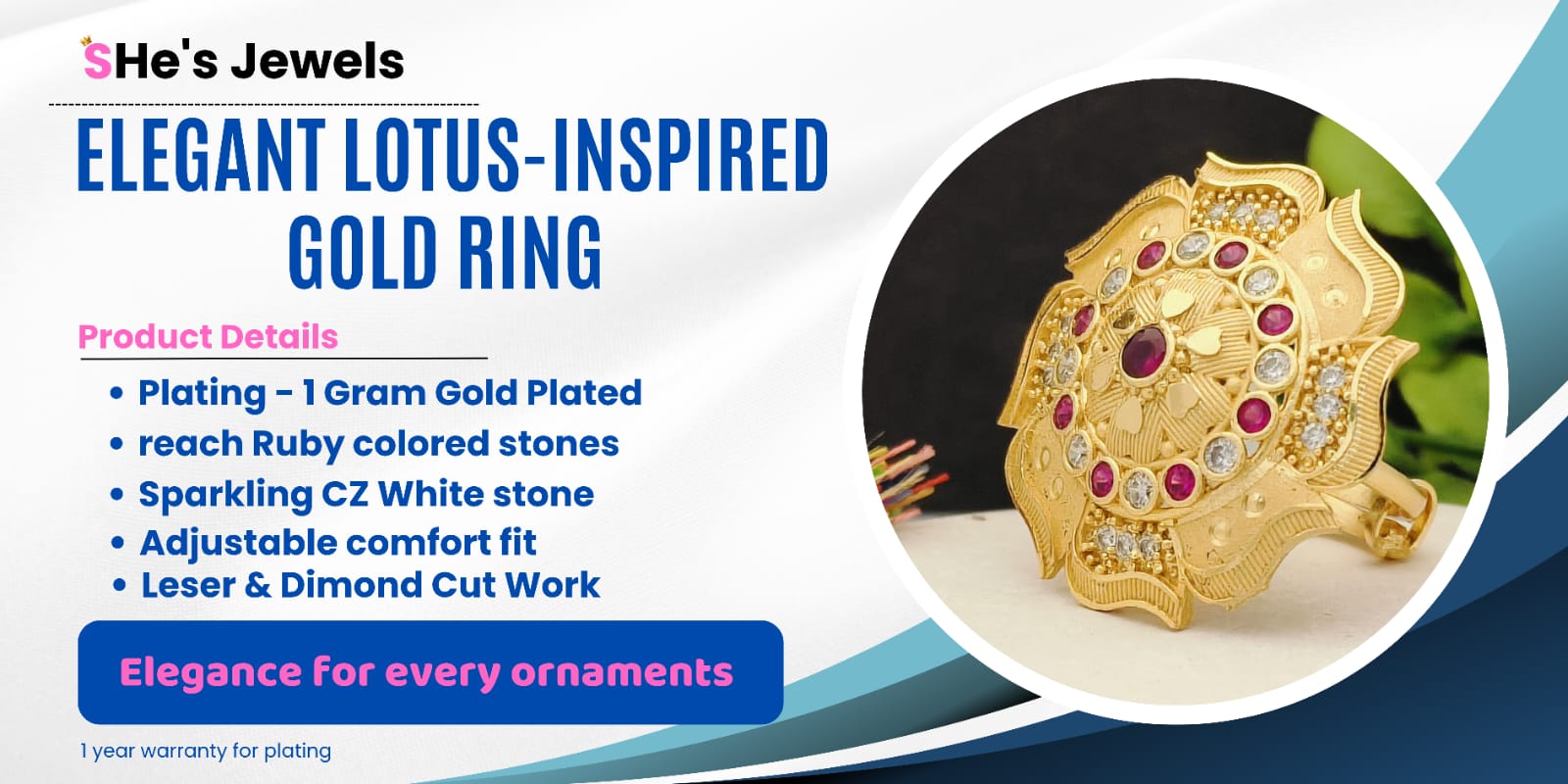- Design: The ring showcases a prominent, multi-layered flower with intricate, petal-like borders and a textured, golden finish.