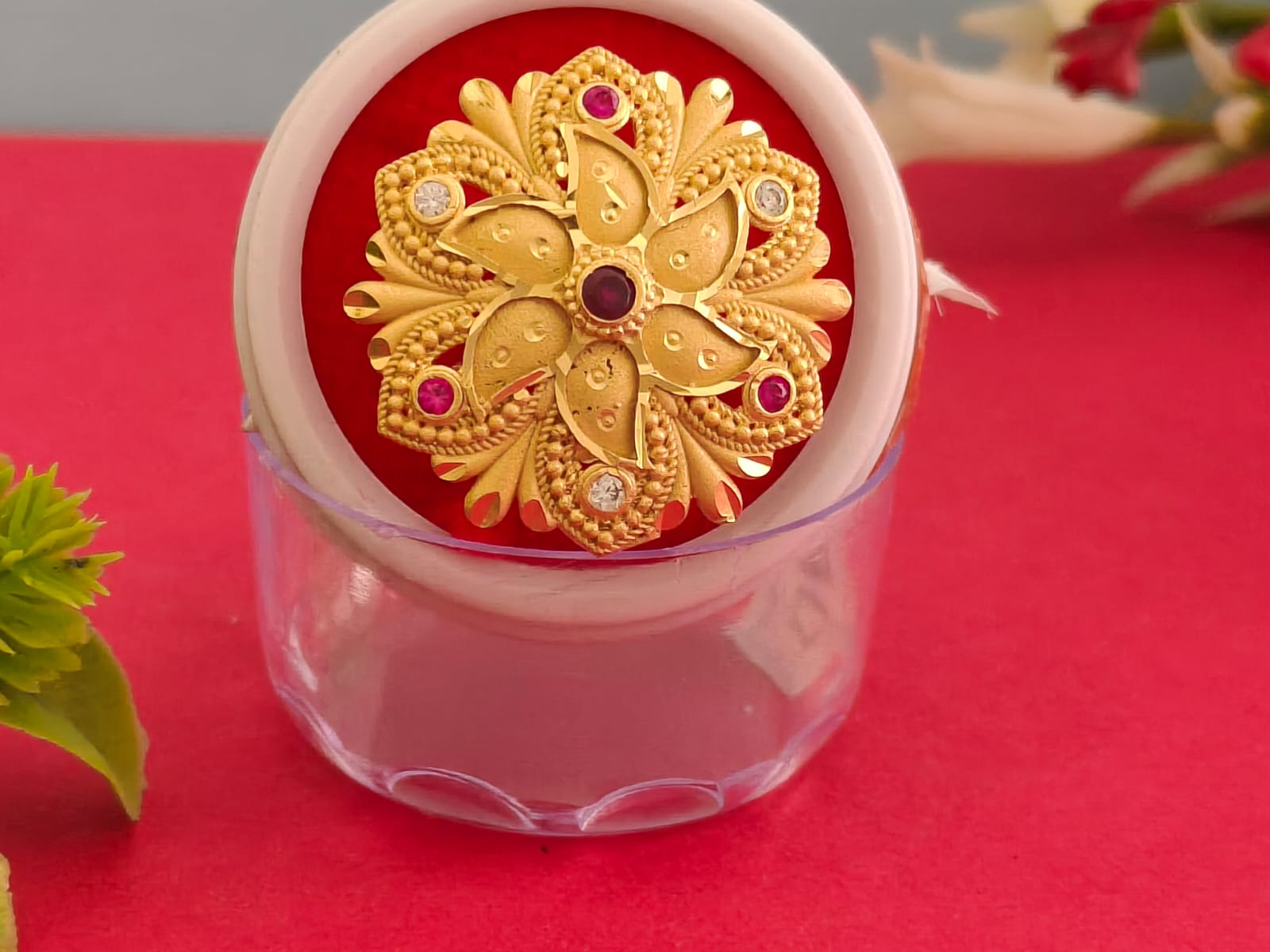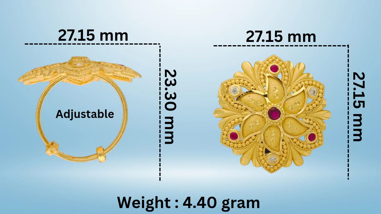 - Detailing: The design incorporates fine gold granulation (Rava work or beadwork) along the edges of the petals, adding texture and a traditional, artisanal feel. The outer layer features leaf-like elements with intricate surface detailing.
