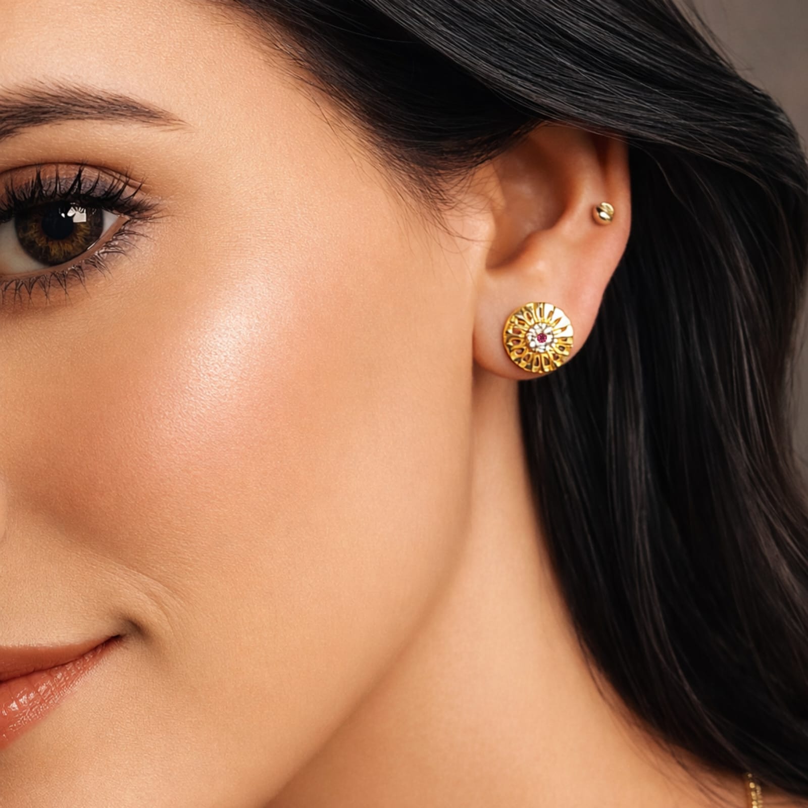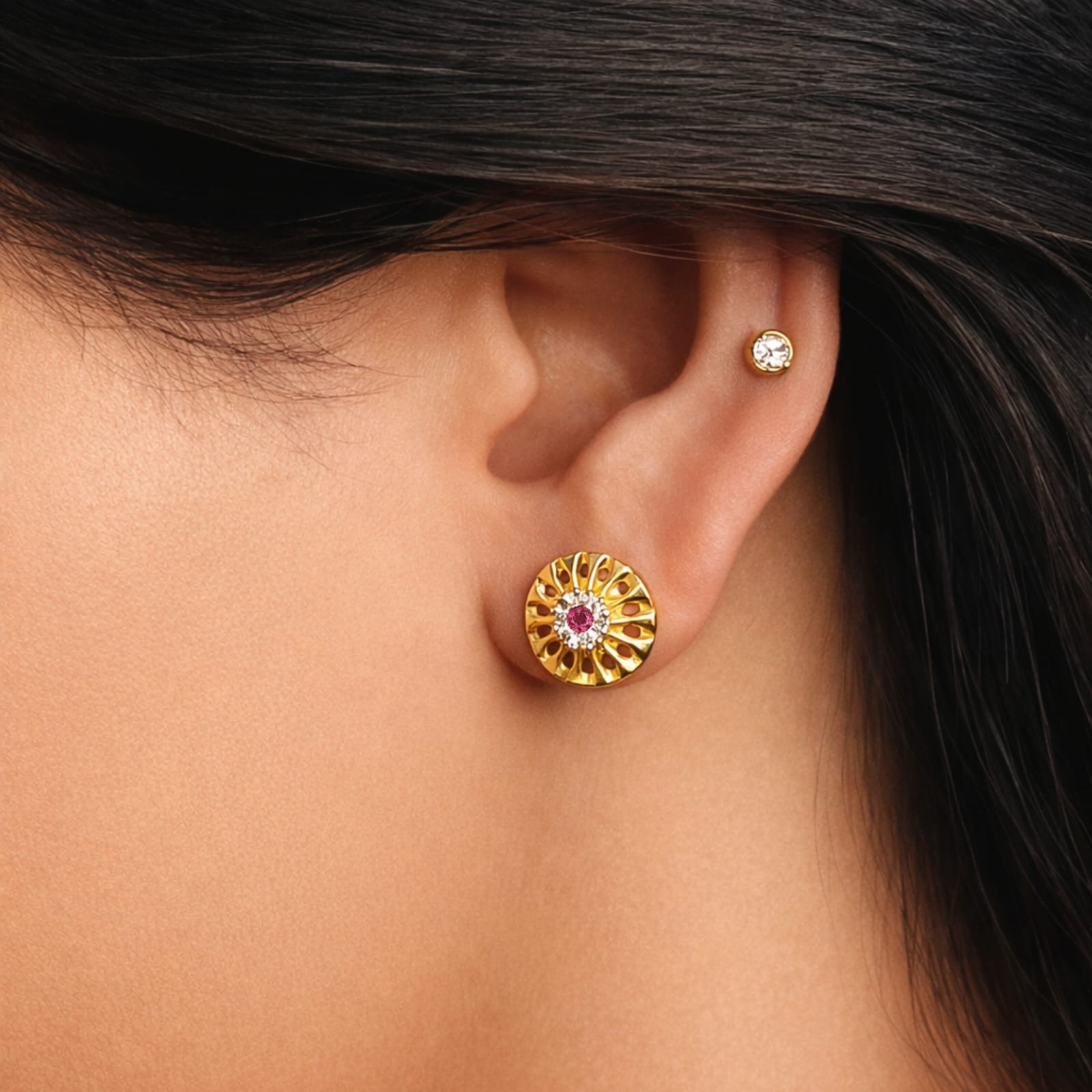 These stunning circular studs feature an ornate open-work filigree design that mimics the radiant rays of a sunburst. At the heart of each earring lies a brilliant cluster of stones, anchored by a vibrant ruby-red center surrounded by a halo of shimmering clear crystals.