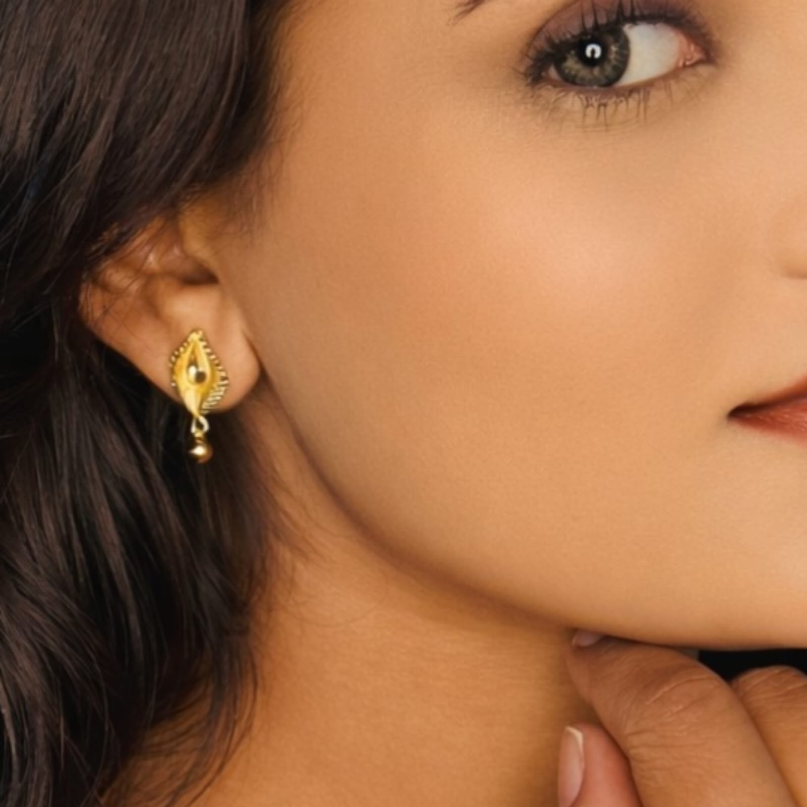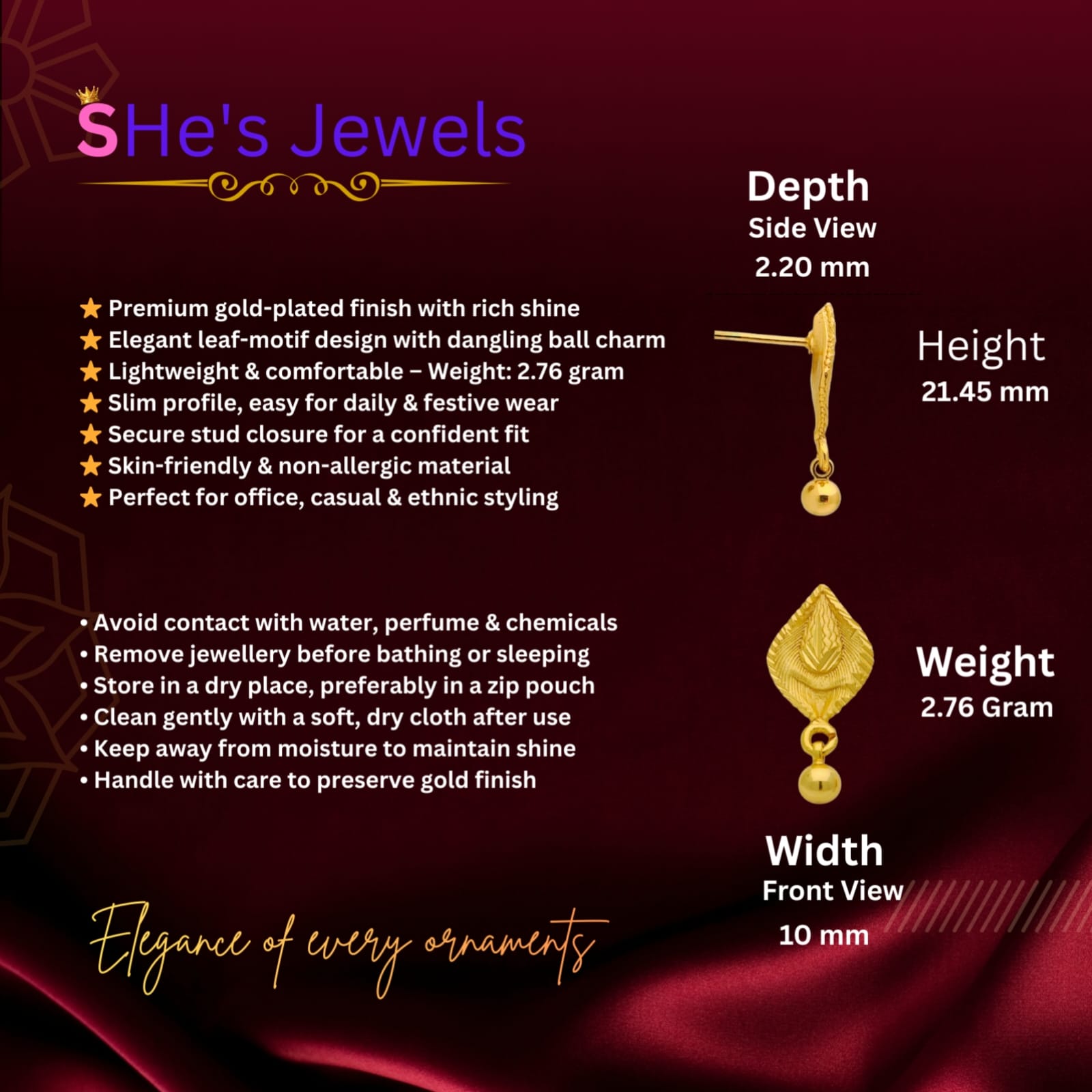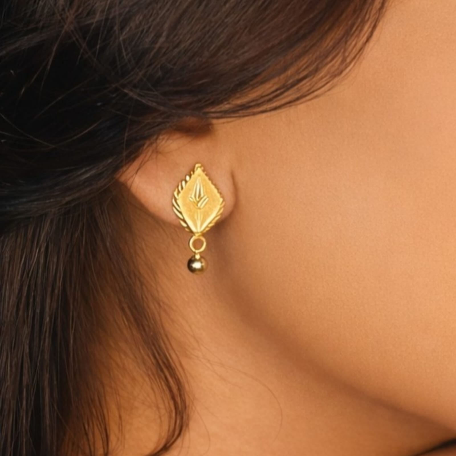 Elevate your jewelry collection with these exquisitely crafted Gold Leaf-Pattern Drop Earrings. Combining the classic appeal of yellow gold with intricate textural artistry, these earrings feature a sophisticated diamond-shape (rhombus) stud adorned with a stylized leaf motif. A high-polish dangling gold bead adds a touch of movement and grace, making them perfect for both daily wear and special occasions.