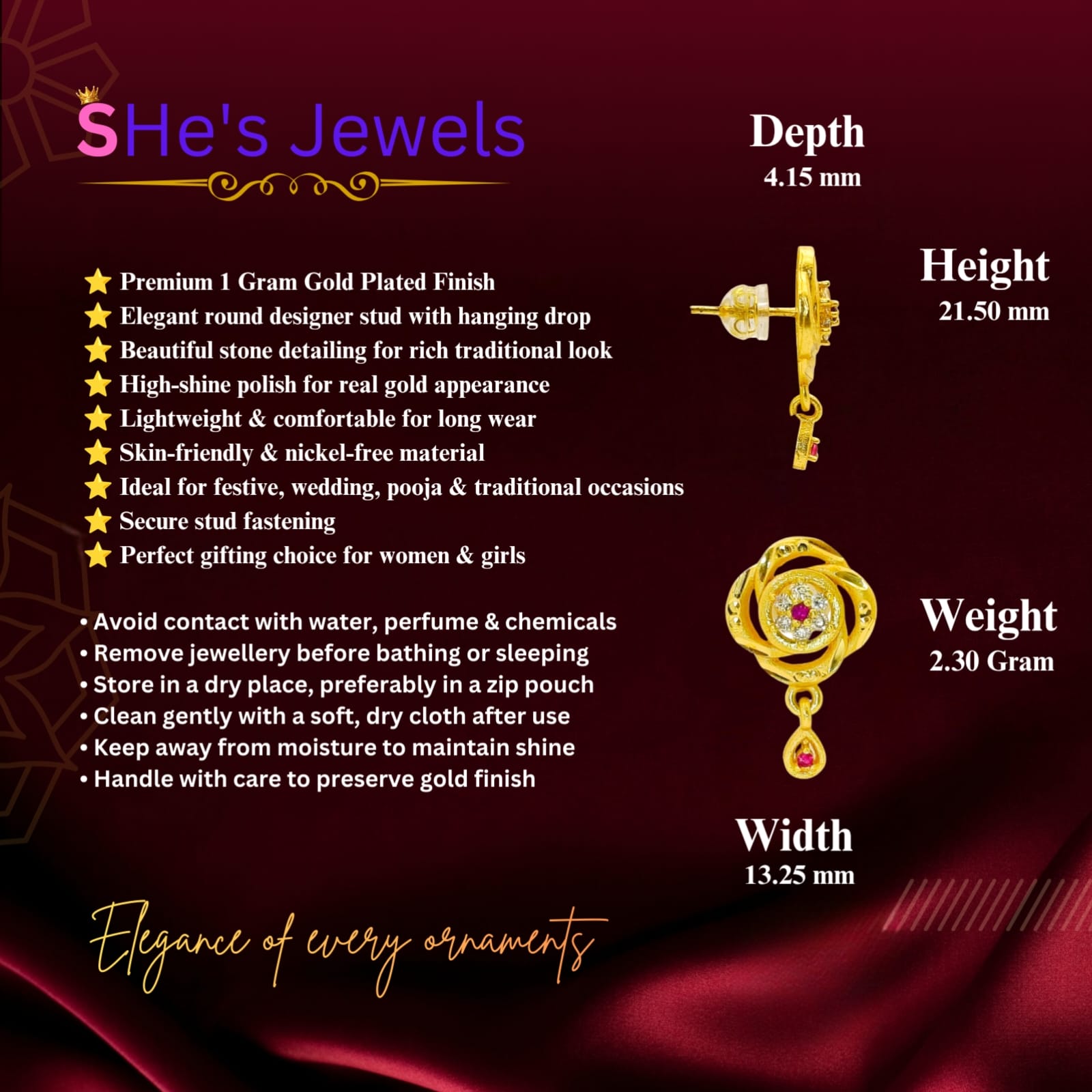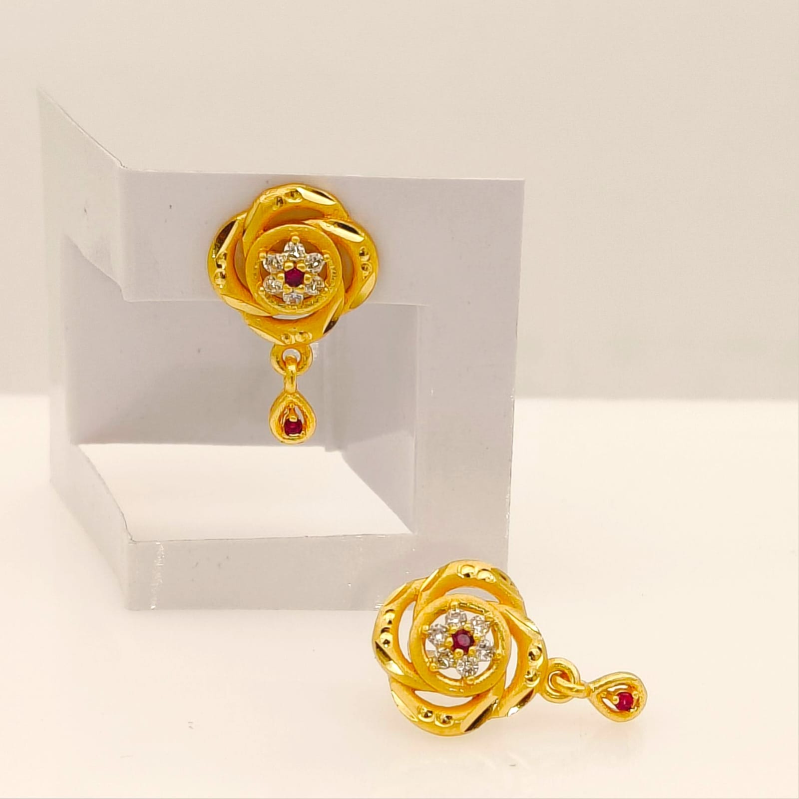 - Elegant Teardrop Dangle: A matching gold-tone teardrop hangs gracefully, accented with a single ruby-red stone to mirror the central design.