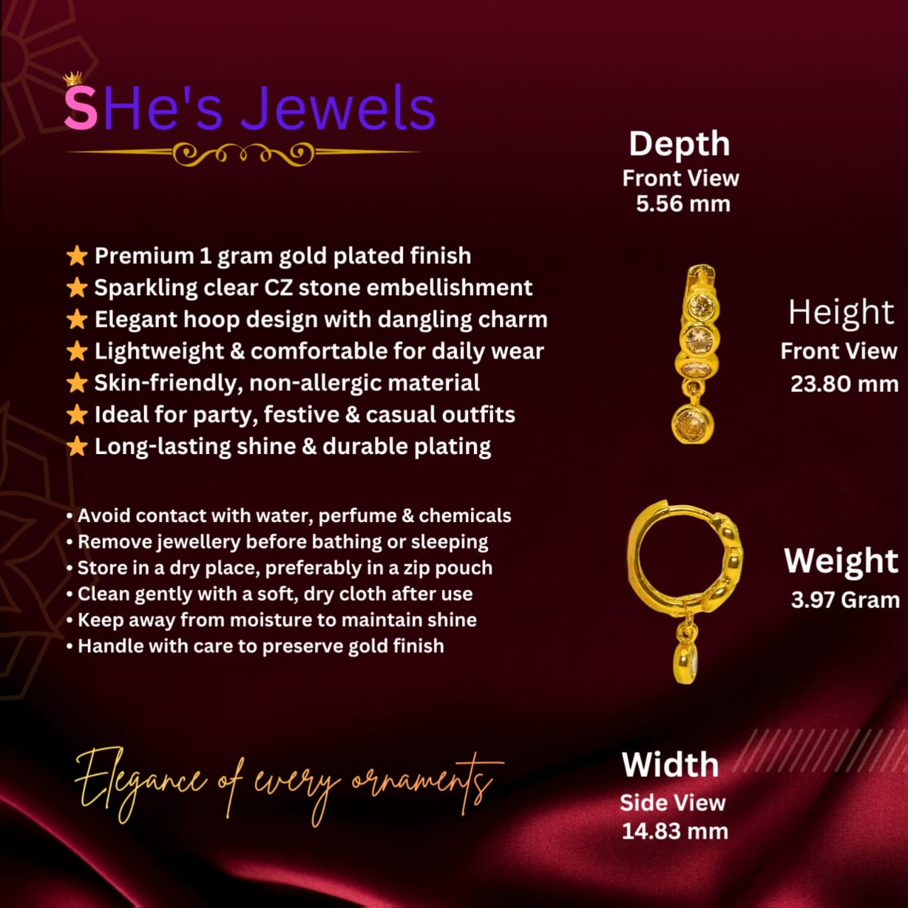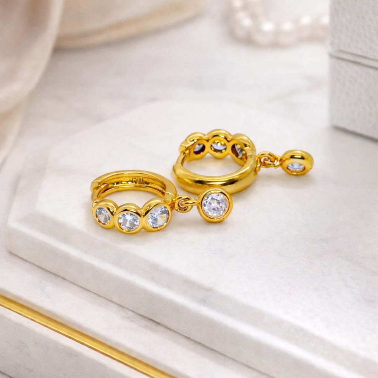 Sophisticated Dangle: A matching round clear stone pendant hangs gracefully from the base of the hoop to capture and reflect light.