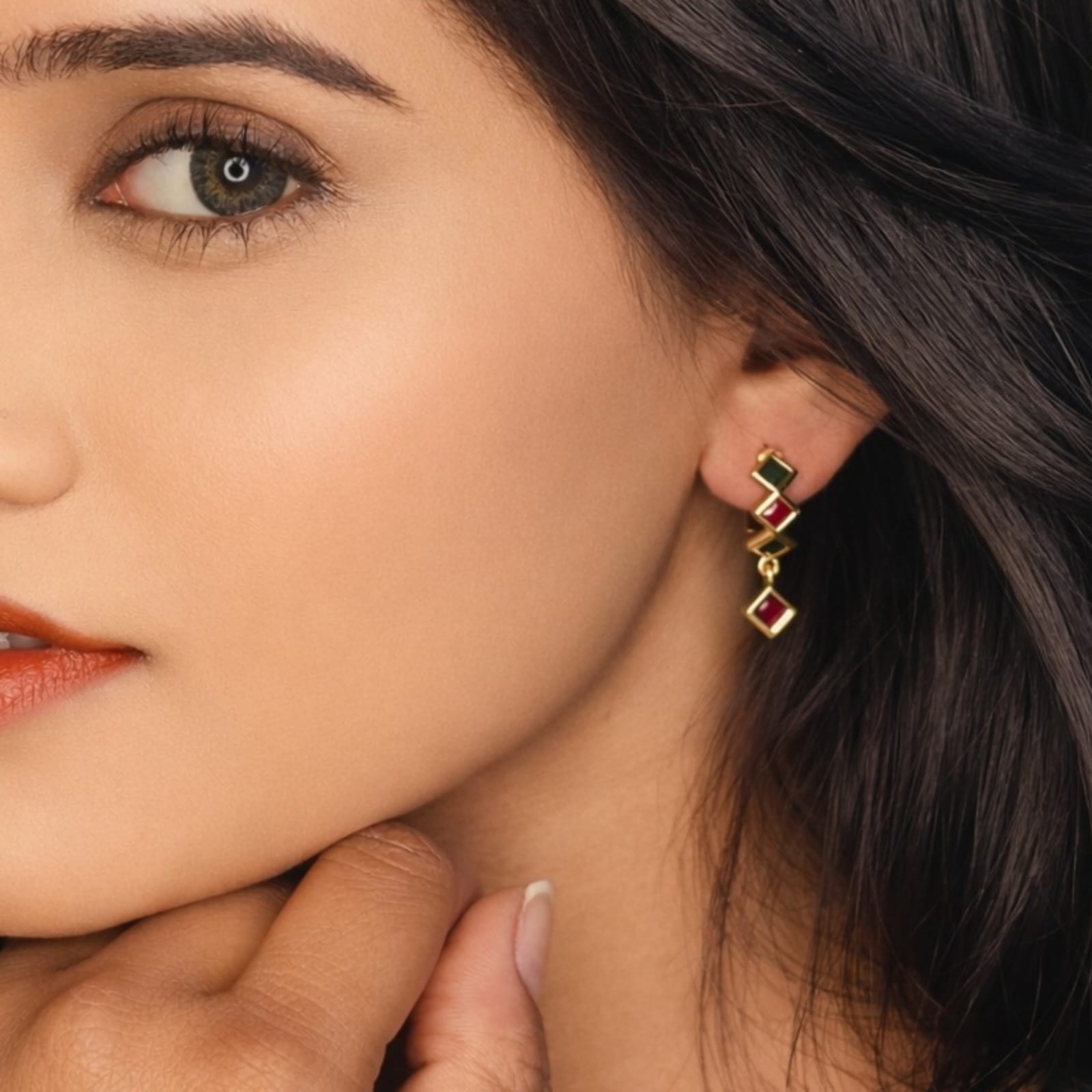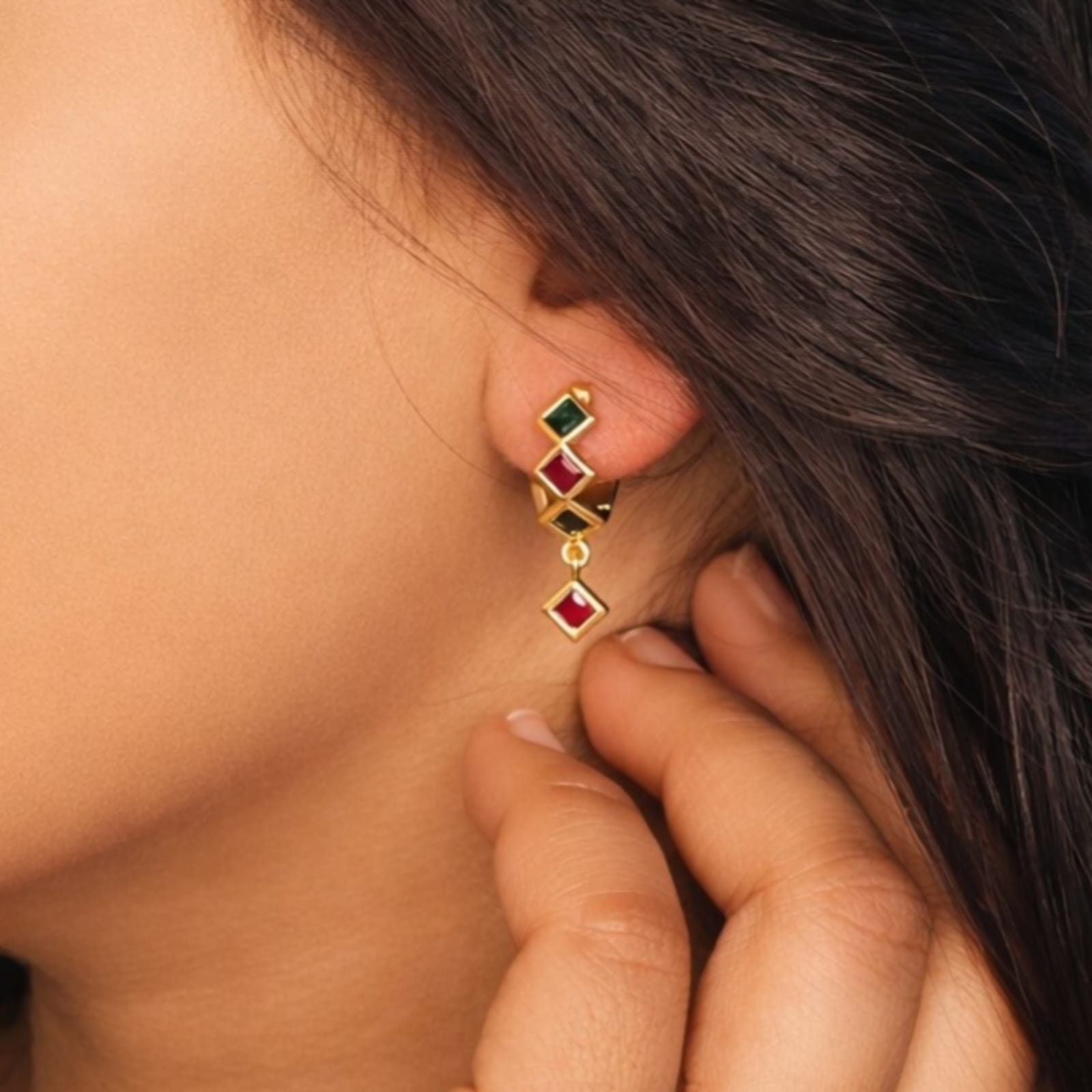 Vibrant Stone Work: The ho70ops are meticulously set with alternating princess-cut synthetic gemstones in rich emerald green and ruby pink.