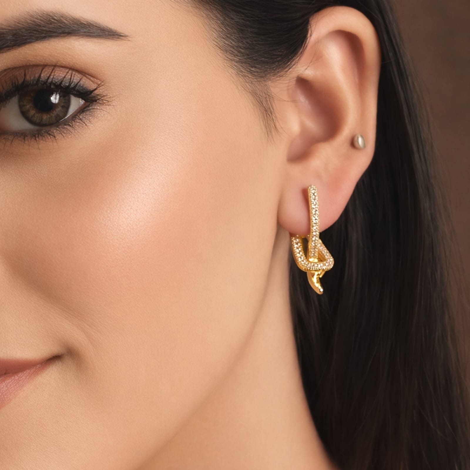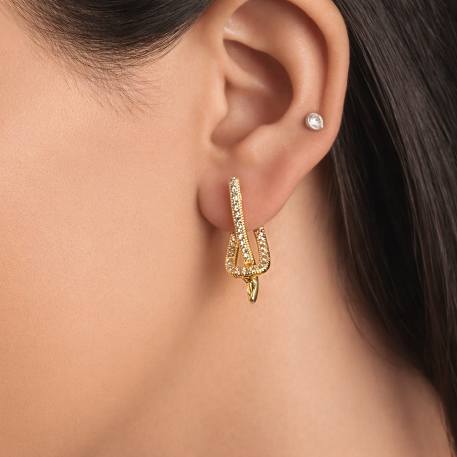Step into contemporary luxury with these Geometric Interlocking Hoops. A bold departure from traditional motifs, these earrings feature a sophisticated "linked" silhouette that combines the warmth of gold with the brilliant fire of precision-set crystals.