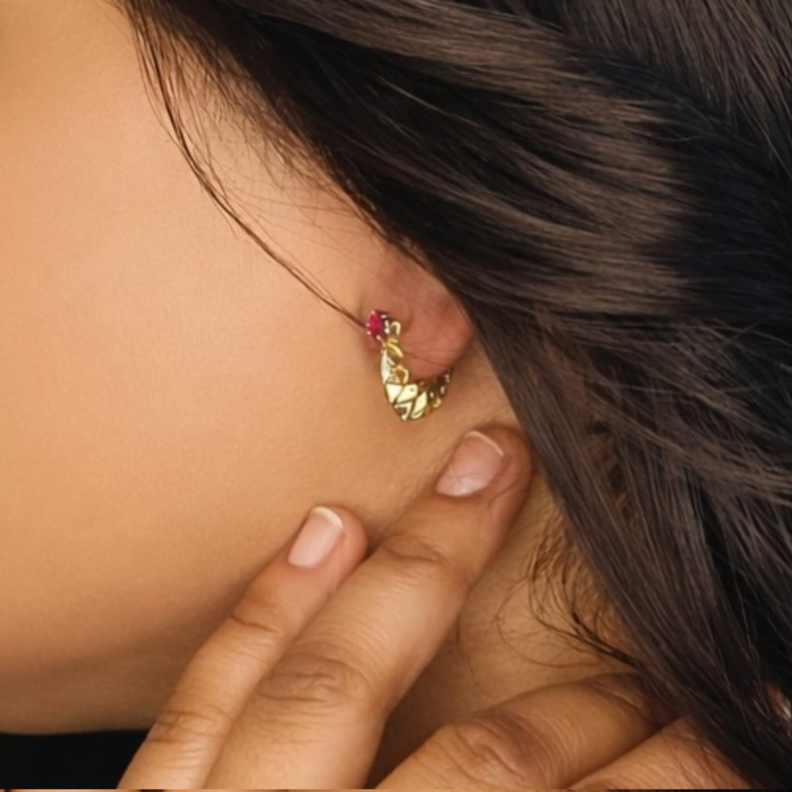 - Vibrant Gemstone: Adorned with a single, brilliant ruby-red stone held securely in a multi-prong setting at the ear post.
