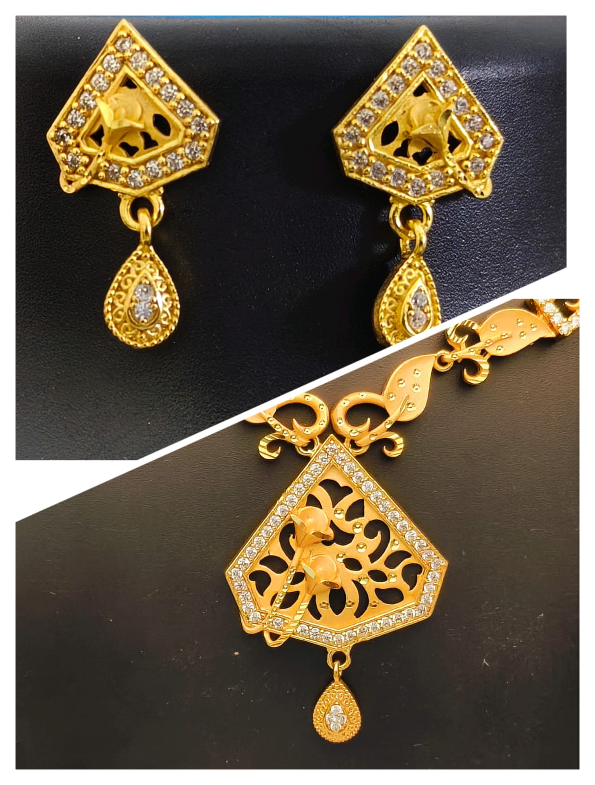 - Pendant: The centerpiece is a prominent, triangular or diamond-shaped pendant featuring detailed filigree work and an inner figurative design (possibly a traditional motif or deity), framed by brilliant CZ stones. A single, pear-shaped CZ drop accentuates the pendant's bottom.