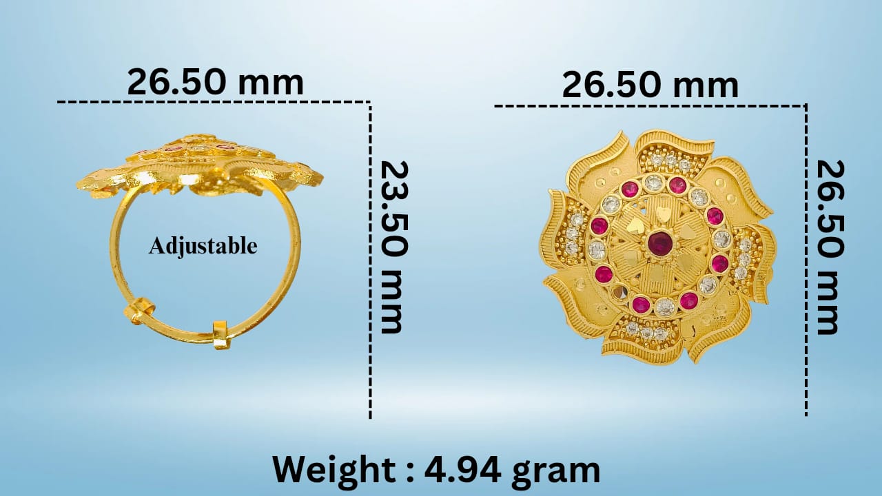 - Design: The ring showcases a prominent, multi-layered flower with intricate, petal-like borders and a textured, golden finish.