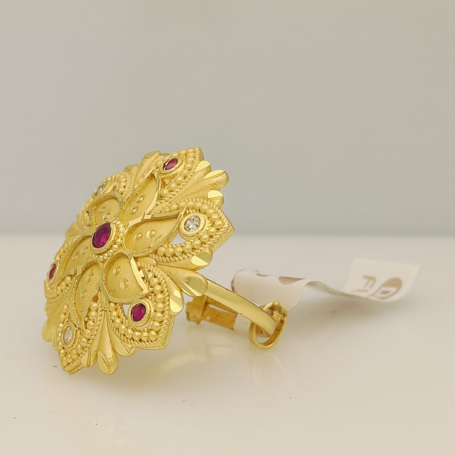- Features small, round-cut red stones (likely rubies or synthetic corundum) centrally placed and interspersed throughout the design.